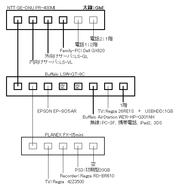 写真は、我が家のネットワーク機器の中枢部。右からHomeGateWay:PR-400MI、内向けサーバ:LS-VL、 AirStation:WZR-HP-G301NH、外向けサーバ:LS-GL、バックアップ用USB-HDDの順。 外向けのサーバは玄箱から始まって、玄箱HG、と進んで現在はLS-GL。結構気に入っています。SATAなので将来も安心?